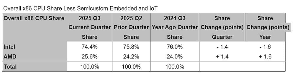 En el global de CPU x86, la fotografía se repite: Intel baja al 74,4% y AMD sube al 25,6%. Un trimestre más de retroceso para los azules y un avance consistente para los rojos.