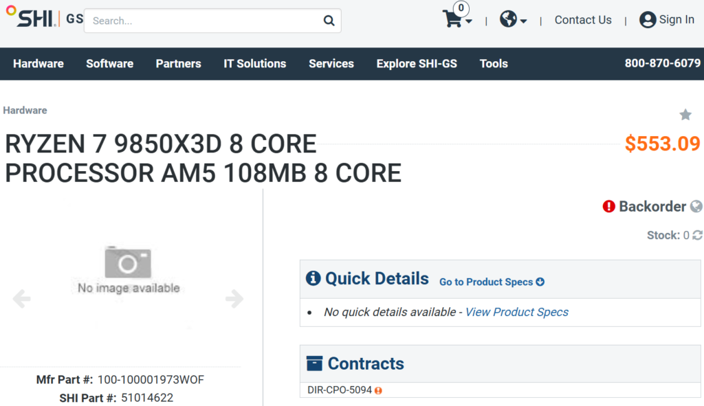 Los listados europeos han encendido las alarmas. En Suiza, Orderflow.ch publicó un precio de 473.55 CHF (aproximadamente 20% más que el 9800X3D), mientras que el distribuidor estadounidense SHI lo sitúa en $553 USD, unos 70 dólares por encima del MSRP de lanzamiento de su hermano menor.