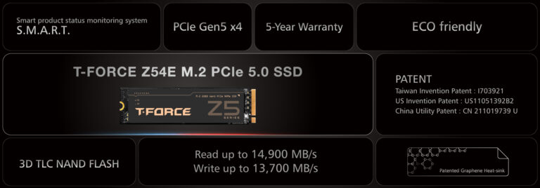 Disponible en versiones de 1 TB, 2 TB y 4 TB, el Z54E utiliza memoria NAND 3D TLC de alta densidad, asegurando una durabilidad que impresiona: hasta 2.400 TBW en el modelo de 4 TB. Y como no podía faltar en la gama T-FORCE, incluye un disipador de grafeno ultrafino, con opción de añadir refrigeración líquida o activa para quienes buscan el máximo control térmico.
