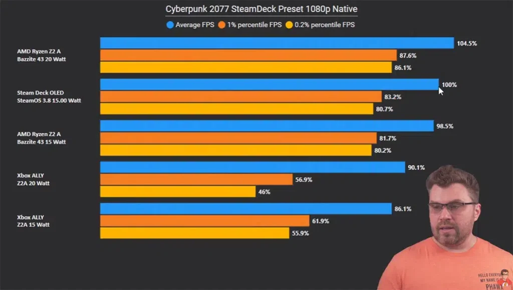 En pruebas con Cyberpunk 2077 a 720p, la ROG Ally con Ryzen Z2 A sorprendió con sus resultados. Con Windows 11 ofrecía un rendimiento correcto, pero al instalar Bazzite, las cifras mejoraron notablemente. A 15W de TDP alcanzó 36,2 FPS, y al subir a 20W logró 38,8 FPS, superando incluso a la Steam Deck OLED.