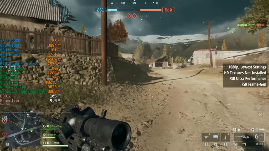 El equipo de pruebas usó un Intel Core i5-12400F y una resolución de 1080p. Con la calidad baja, ambas tarjetas lograron entre 50 y 60 FPS. Llegaron al límite de su VRAM, pero se mantuvieron estables. Los métodos de escalado como FSR o XeSS apenas ofrecieron mejoras. Sin embargo, reducir la resolución al 60 % permitió alcanzar 60 FPS más fluidos, aunque con una imagen menos nítida.