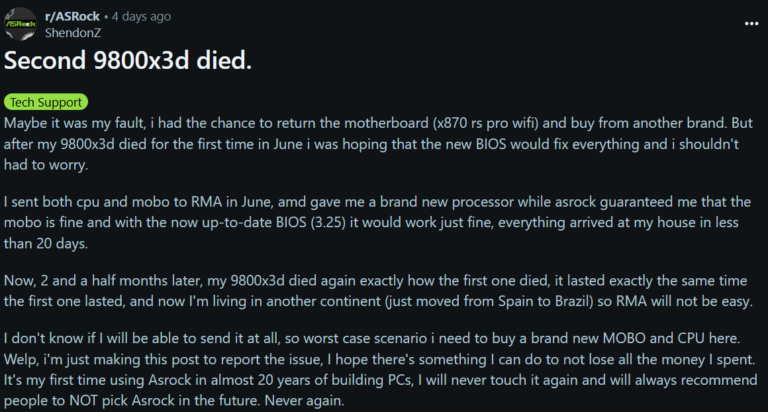Aunque ShendoZ no mostró fotos ni pruebas del daño, su historia ha generado preocupación entre los entusiastas del hardware. Muchos recuerdan viejos casos de incompatibilidad entre BIOS y procesadores de gama alta.