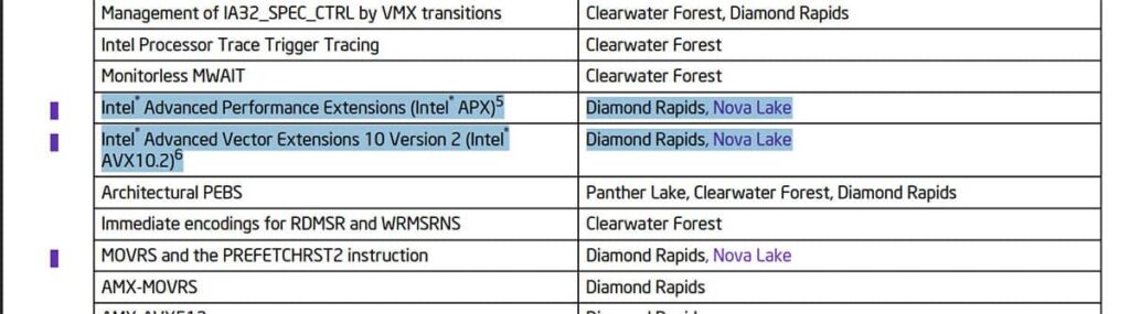 La revisión 059 de la documentación técnica filtró lo peor: Intel planeaba eliminar AVX10, AMX y APX del camino hacia Nova Lake. Ahora, la revisión 060 corrige el rumbo. Con ello, AVX10.2 y APX vuelven como parte oficial de la arquitectura, tanto en Nova Lake como en los futuros Xeon Diamond Rapids.