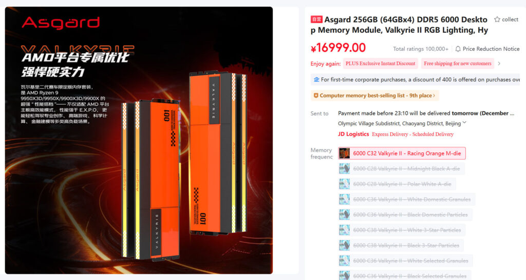 Estamos hablando del kit Valkyrie de 256 GB. Su valor actual alcanza los 16,999 yuanes chinos. Mientras tanto, la mismísima NVIDIA GeForce RTX 5090 D V2 se comercializa oficialmente a 16,499 yuanes. Esta versión es exclusiva para el mercado asiático. Sí, leíste bien: medio terabyte de RAM te costará 500 yuanes más que la GPU definitiva para gaming y creación de contenido.