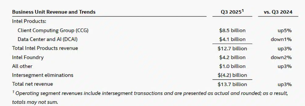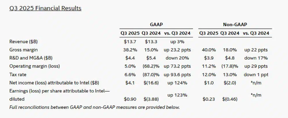Intel vuelve a encender sus motores. Tras varios trimestres difíciles y una reestructuración profunda, la compañía azul retoma el camino de los beneficios con resultados sorprendentes. En su informe financiero del tercer trimestre de 2025, la empresa registró 13.700 millones de dólares en ingresos, un aumento del 3% interanual. Su beneficio neto alcanzó los 4.100 millones, lo que supone una recuperación del +124% frente al año pasado.