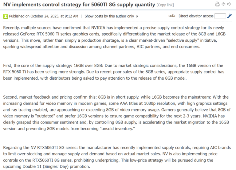 El informe también indica que NVIDIA pidió no acumular inventario de 8 GB ni aplicar grandes descuentos, ni siquiera durante las ofertas de noviembre. Ambas versiones usan la misma GPU; solo cambia la cantidad de memoria. La de 16 GB cuesta unos 70 dólares más, una diferencia asumible para quienes buscan mayor rendimiento y duración a futuro.