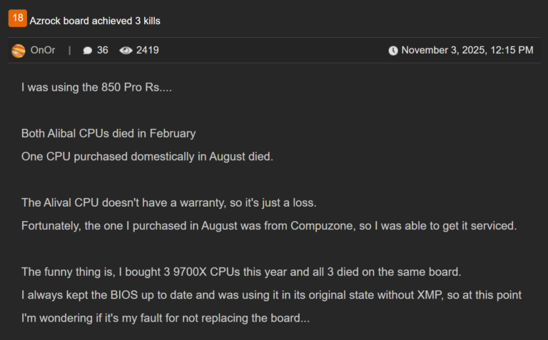 Por ahora, no hay fotografías, pruebas de laboratorio ni declaraciones oficiales. ASRock guarda silencio, y AMD tampoco se ha pronunciado sobre una posible incompatibilidad o lote defectuoso.