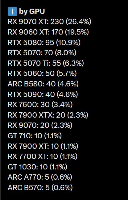 Por su parte, la Radeon RX 9060 XT ocupa el segundo lugar. Registró 170 unidades, equivalentes al 19,5% de participación. Adicionalmente, este modelo tiene una ventaja adicional importante. Está disponible en configuraciones de 8GB y 16GB. Sin embargo, la variante de 16GB genera mayor interés entre compradores.