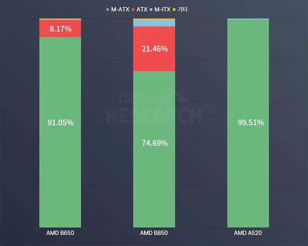 Otro fenómeno interesante emerge al analizar los formatos. Históricamente, las placas M-ATX dominan las estadísticas. Alimentan el mercado de equipos premontados: el 91% de las B650 vendidas corresponden a este factor de forma compacto. Sin embargo, las B850 cuentan una historia diferente. Aunque el M-ATX sigue liderando con 74,69%, ahora existe un saludable 21,46% de modelos ATX. Incluso hay una presencia testimonial de Mini-ITX. Esta diversidad solo puede significar una cosa. Los entusiastas que arman sus propios sistemas están apostando fuerte por la nueva generación.