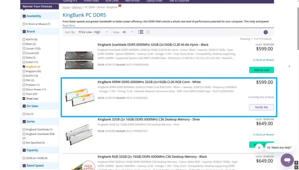 El protagonista de la prueba es un kit DDR5-6000 CL36 de 32 GB de KingBank, disponible en el mercado australiano por aproximadamente 599 AUD. Su competidor directo, con especificaciones comparables pero con chips de marcas consolidadas, ronda los 649 AUD. Son apenas 50 dólares australianos de diferencia, pero en un mercado donde cada céntimo cuenta, ese margen puede inclinar la balanza para muchos compradores que arman su setup sin presupuesto ilimitado. La pregunta no era si era más barato, sino si esa diferencia de precio implicaba algún tipo de sacrificio real en el mundo práctico.