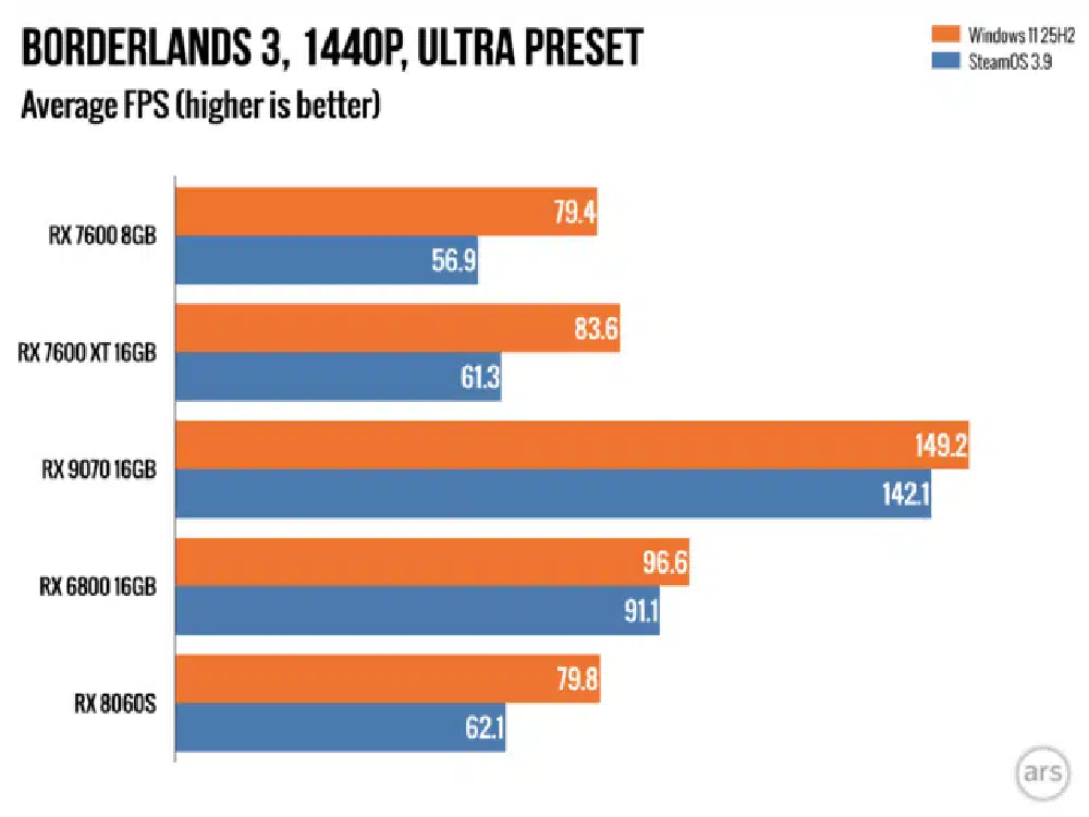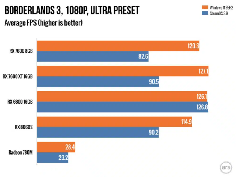 La tendencia continúa con hardware más potente: una RX 6800 registra 121 FPS en Windows contra 99 FPS en SteamOS. Incluso modelos recientes como la RX 8060S mantienen este patrón con cifras casi idénticas de 93 y 92 FPS. El dato más intrigante llega con la gráfica integrada Radeon 780M, donde Linux sorprende con 33 FPS frente a los 31 FPS de Windows, rompiendo la norma establecida.
