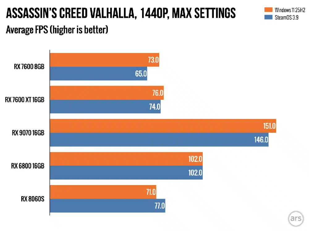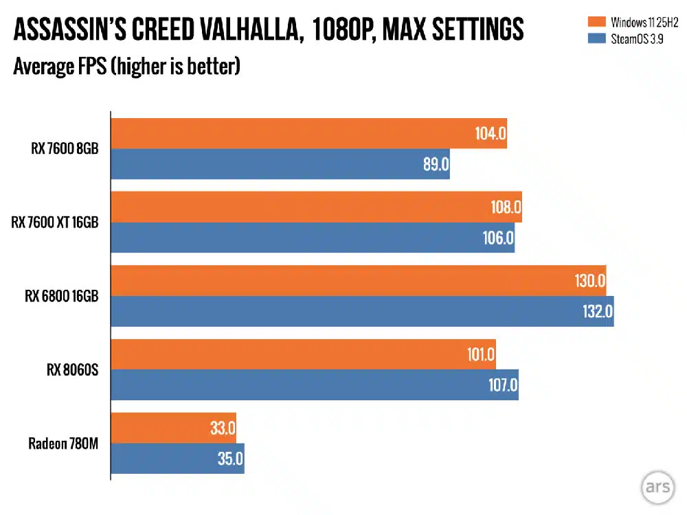 En Assassin’s Creed Valhalla observamos un panorama completamente diferente. Con configuración máxima en 1080p, la RX 6800 entrega 130 FPS en Windows y 132 FPS en SteamOS, prácticamente un empate donde Linux incluso toma una mínima ventaja. La RX 7600 XT muestra números casi gemelos: 108 FPS bajo Windows y 106 FPS en SteamOS, evidenciando que en rasterización tradicional el abismo prácticamente desaparece. Nuevamente, la Radeon 780M favorece a SteamOS con 35 FPS contra 33 FPS en Windows.
