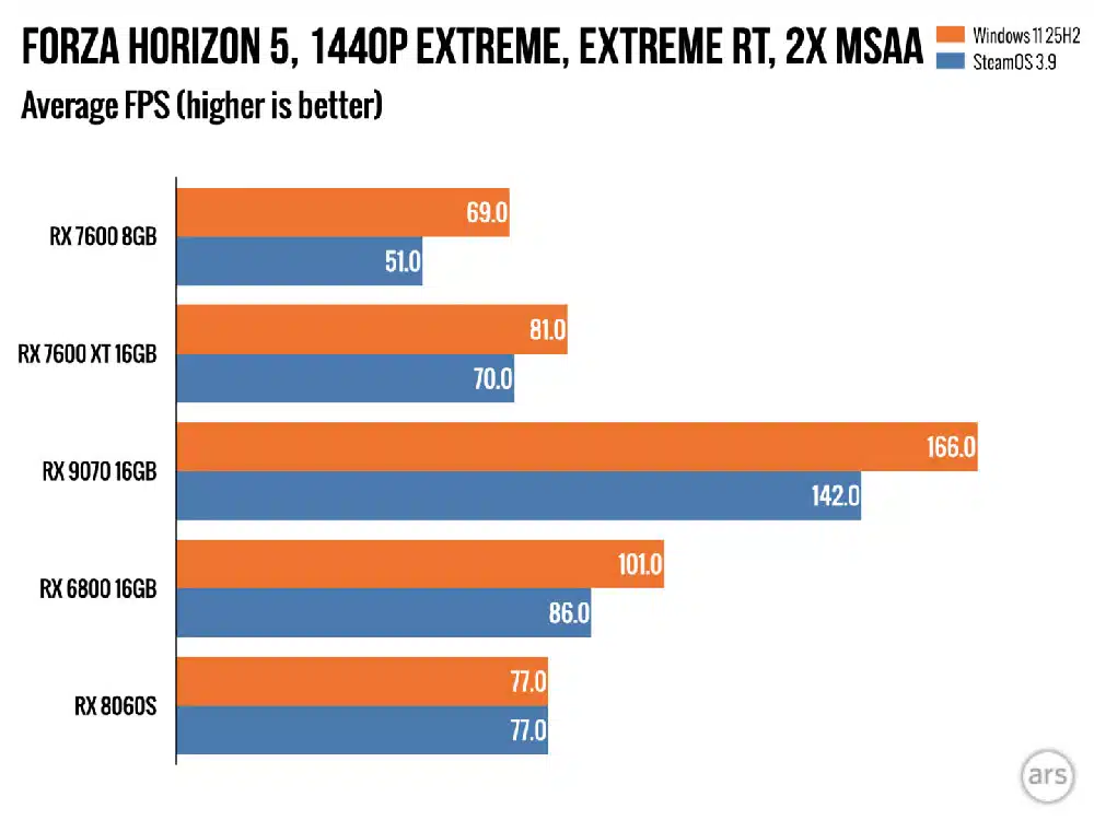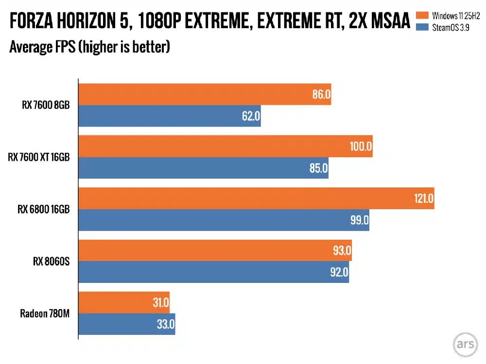En juegos con rasterización exigente como Forza Horizon 5, Windows 11 establece su liderazgo de forma contundente. Ejecutando el preset “Extreme” con Ray Tracing en 1080p, una Radeon RX 7600 con 8 GB alcanza 86 FPS bajo Windows, mientras que en SteamOS apenas logra 62 FPS. Al subir a la RX 7600 XT con 16 GB, la distancia se acorta pero no desaparece: 100 FPS versus 85 FPS respectivamente.