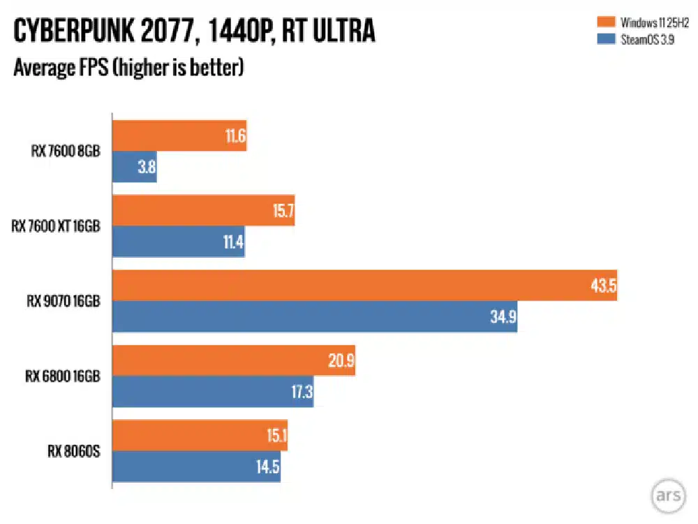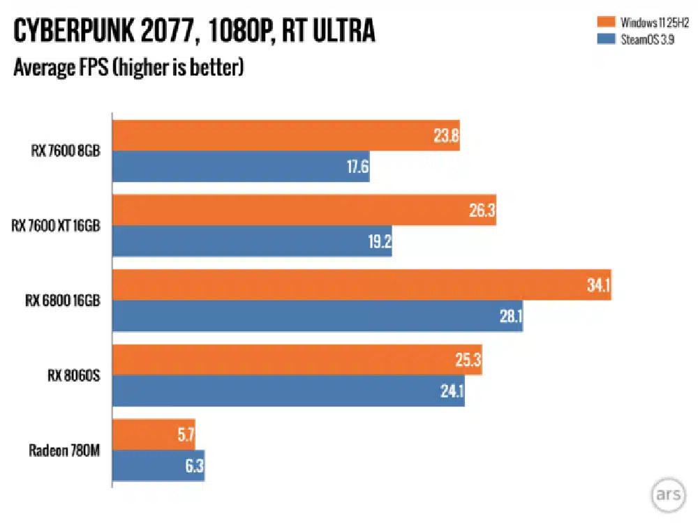 Cyberpunk 2077 refuerza el comportamiento ya establecido. Ejecutando RT Ultra en 1080p, la RX 6800 marca 34.1 FPS en Windows y 28.1 FPS en SteamOS. La RX 7600 registra 23.8 FPS versus 17.6 FPS respectivamente, una brecha que se amplifica dramáticamente en 1440p: 11.6 FPS en Windows contra apenas 3.8 FPS en SteamOS. La Radeon 780M se comporta marginalmente mejor en SteamOS sin Ray Tracing, pero se hunde cuando el trazado de rayos se activa.