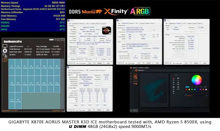 Más allá de la pantalla, lo que realmente importa es que XFinity+ presume velocidades de vértigo. En plataformas AMD AM5, un kit de dos módulos de 24 GB alcanzó los 9.000 MT/s con latencias CL42, certificado sobre una GIGABYTE Aorus Master X3D Ice. En el lado azul, sobre una placa Intel Z890, la cifra subió ligeramente a 9.068 MT/s con resultados igual de estables, comprobados con RunMemtestPro.
